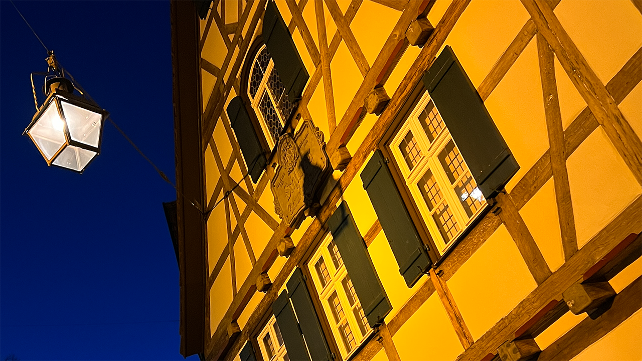 schen Fachwerkstrukturen mit ihren farbigen Fenster-